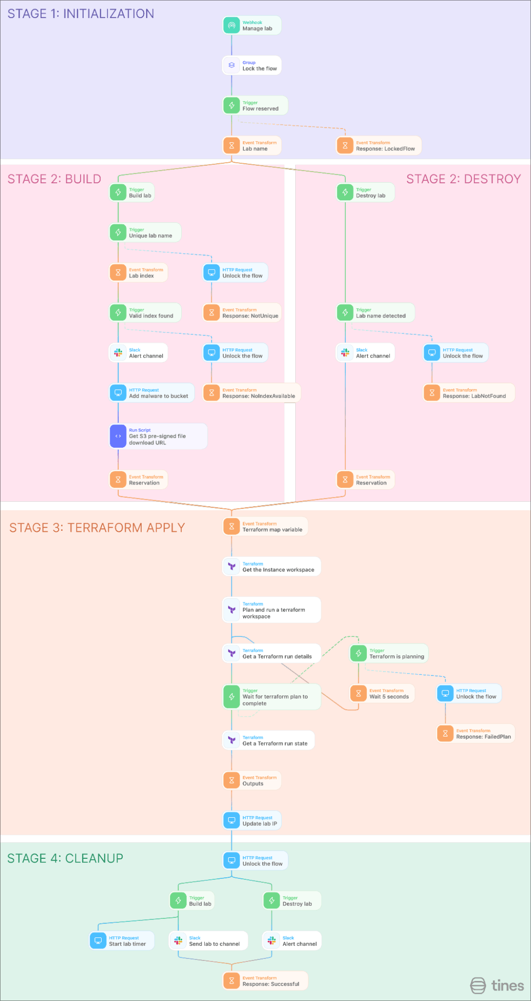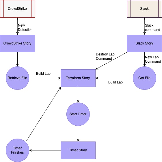 Since we have Terraform managing the lab infrastructure, Tines can be used to orchestrate between Terraform and various other tools that might be used to start one of these labs. To start this orchestration, we need to use automation to build and destroy labs in Terraform.