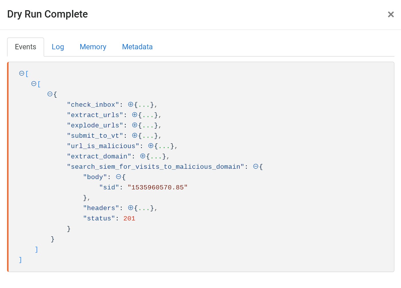 }When we dry-run this Action, we can see that Splunk returns a search id called “sid” which we can use to find the results of the search.