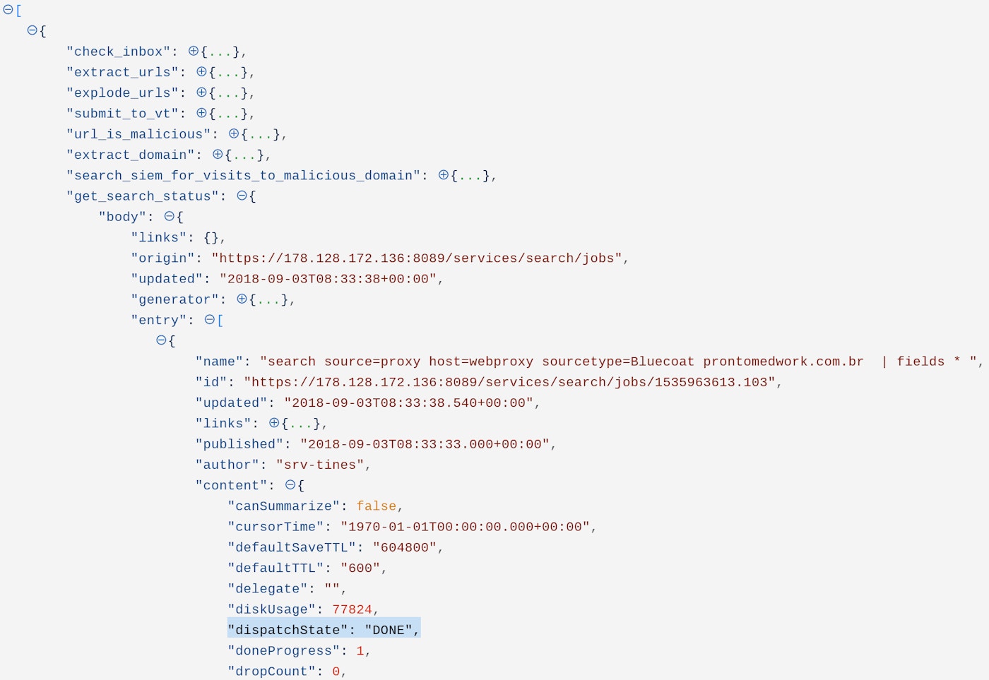 }This Action returns the status of the search in a field called “dispatchState”. A value of “DONE” indicates that the search is complete, a value of “RUNNING” means the search is still in progress.
