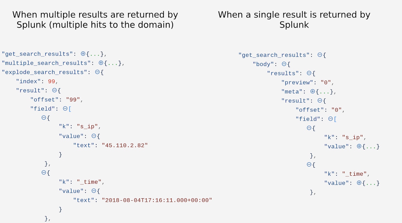 }As Splunk returns a different structure when there are one result and multiple results, we’ll build two Trigger Actions to account for both cases. Their respective options blocks are shown below: