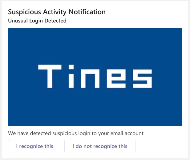 }The last step is to send a notification to the user – this can be done very easily using templates from any of the cards above. You can include a prompt that will automatically take the next step – e.g. escalating to on-call, closing an incident, or locking an account. The prompt can also force a second-factor confirmation through Tines using a tool like DUO or Okta.