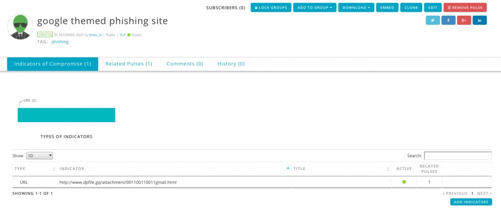 This simple request automatically creates a Pulse in AlienVault OTX. This pulse is public and contains all the information we originally sent to the webhook above: