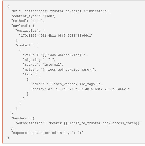 curl -k -H "Content-Type: application/json" -X POST -d '{"enclaveIds":["c04caa4e-4d1b-47fc-b9e2-c9ce11396b44"],"content":[{"value":"55.66.77.88","sightings":32,"source":"internal","notes":"internal IP","tags":[{"name":"indicator-tag-1","enclaveId":"c04caa4e-4d1b-47fc-b9e2-c9ce11396b44"},{"name":"indicator-tag-2","enclaveId":"c04caa4e-4d1b-47fc-b9e2-c9ce11396b44"}]}],"tags":[{"name":"api-tag","enclaveId":"c04caa4e-4d1b-47fc-b9e2-c9ce11396b44"}]}' -H "Authorization: Bearer {access_token}" https://api.trustar.co/api/1.3/indicatorsIn Tines, a HTTP Request Action is used to make a "Post" request to the Trustar API. Similar to the AlienVault Action we are sending Trustar data that was sent to the webhook above: