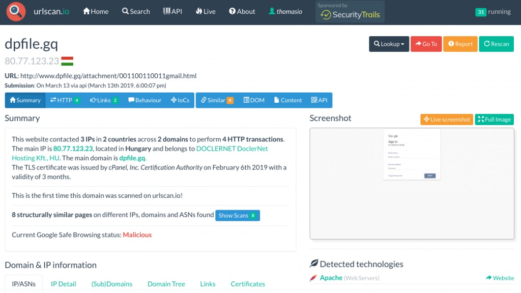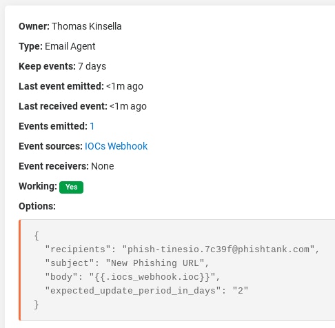 In Tines, we can create an email Action to submit the malicious URL as part of the email body: The configuration for an Email Action to submit data to phishtank. Using Curl you can submit a URL for public sharing and analysis using the below command: To read more about reporting Phish to Phishtank click Urlscan – Sharing URLs. Phishtank is smart enough to extract URL, scan it, and allow community voting on whether or not it is malicious: Urlscan.io is a free online service which scans and analyse websites. Due to its widespread use and quality of the data it is becoming one of the most popular threat intelligence platforms. Urlscan has an easy to use Rest API, and submitting URLs for scanning is straight forward. To get started you need to sign up for a free account and request an API Key.