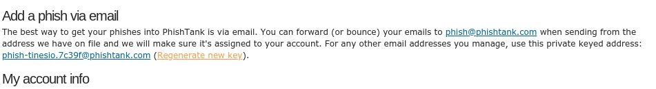 In contrast to AlienVault and Trustar, Phishtank to not have an API for submitting malicious URLs. They do, however, provide a mechanism submit URLs via email directly. When you create a Phistank account you receive a private submission email address: