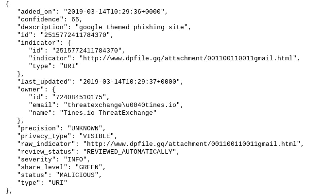 Similarly, to create a pulse using Tines with the data sent to the webhook, you can create a HTTP Request "Post" Action. When we add the webhook as an “Event Source” this Action receives the event emitted by the webhook Action, and can read the event’s parameters and be referenced using the json path of those parameters. For example, adding {{.iocs_webhook.ioc}} to the HTTP Request "Post" Action will send through the URL in the image above in the “name” parameter of the payload. Similarly, {{.iocs_webhook.ioc_type}} will pass through the type above, “url” as the indicator type to AlienVault. This Action then sends the relevant information to AlienVault:This simple request automatically creates a Pulse in AlienVault OTX. This pulse is public and contains all the information we originally sent to the webhook above:AlienVault OTX – Creating Pulses. A pulse created using tines.com here. Trustar is another threat intelligence platform popular among “Information Sharing and Analysis Centers” (ISACs) like IT-ISAC or H-ISAC (Health-ISAC). They provide closed-source feeds from entities like Abuse.ch, DHS CISCP, US-Cert, Malware Traffic Analysis and others that can be integrated into your SIEM, Splunk, Endpoint tools etc. Once you have a bearer token, you share data with Trustar using curl: You can augment the above query to send pulses with hundreds of IOCs or update a pulse with more information using a “Patch” command.To submit to IT ISAC you need an Enclave ID to which you have “Full Access” and then include that in your request. You’ll also need to login or create an OAuth2.0 App to get a Bearer token which is included in your request, as below. Trustar – Sharing IOCs to an EnclaveFor a full list of ways to submit data to AlienVault OTX you can read their full documentation.