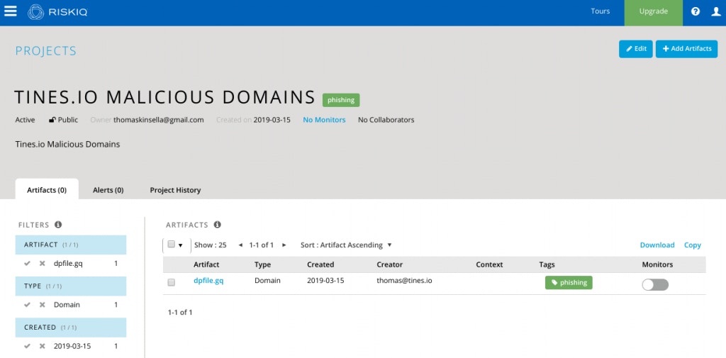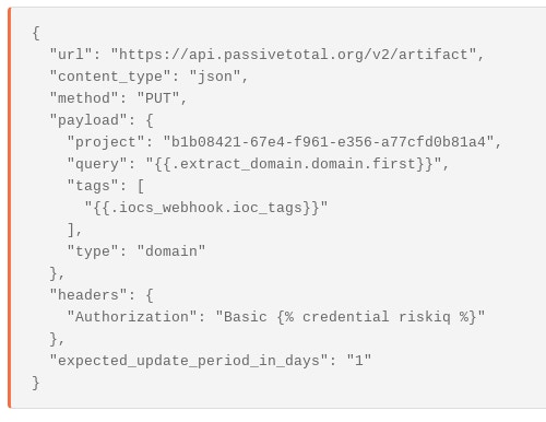 Before submitting any data to RiskIQ you have to create a Project, however this can be done using the UI, or using the API. An Action to create a public project using the RiskIQ API is included in the downloadable Story. Once you have created a project you can easily add IOCs to that project using the curl command below.