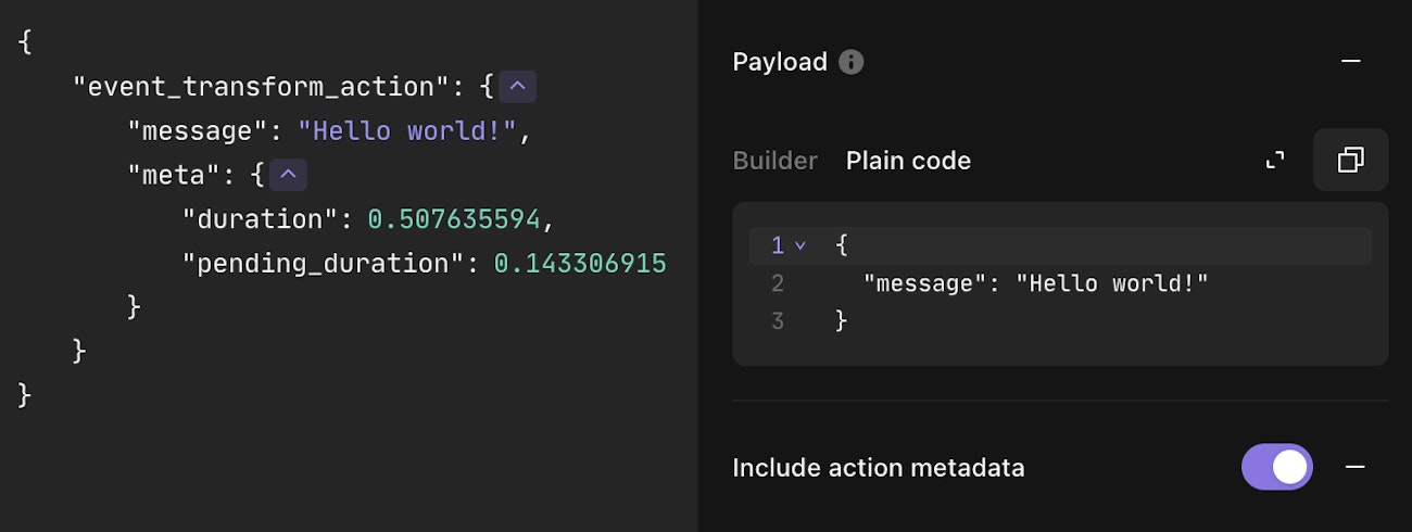 In addition to the common options, many actions also include the Include action metadata option. When enabled, this adds a meta attribute to emitted events, containing metadata about the action run. This metadata is only added if the event is an object.