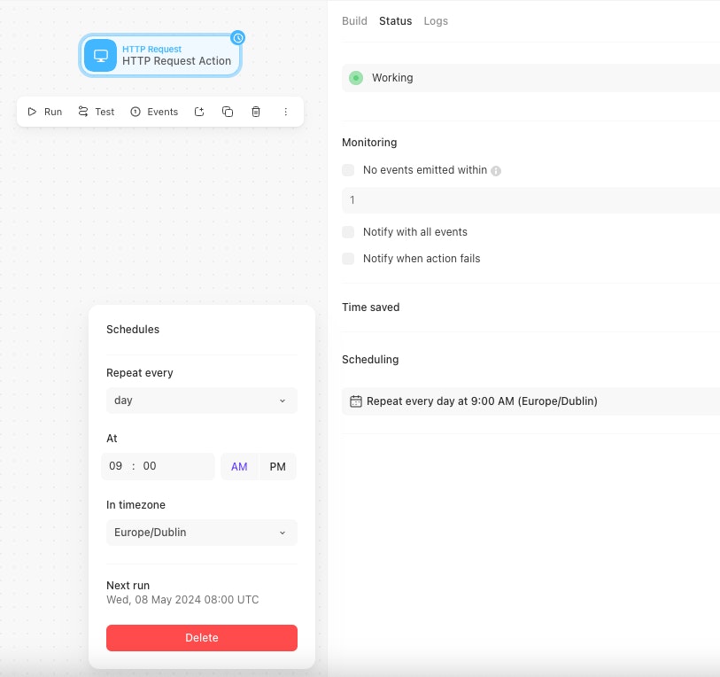 A HTTP Request can be scheduled to run at a specific time, interval & timezone. This can be configured using the Scheduling menu as demonstrated below: