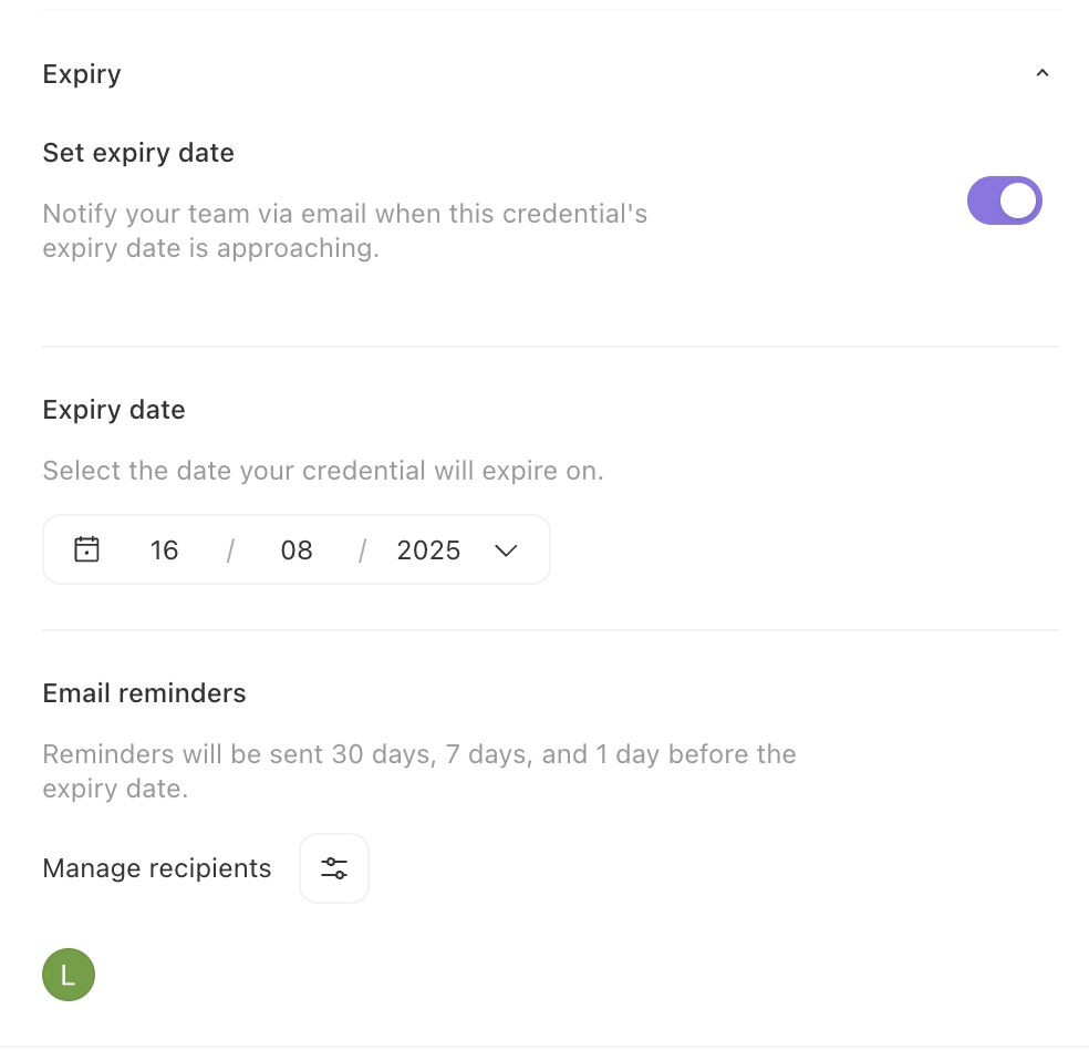 Some credentials may require rotation for security compliance, or they may expire at a certain date. Once expired, the credentials may break workflows if they are not updated. Credential expiry settings aid in ensuring that credentials are updated regularly by notifying selected users that the credential is reaching it's expiry date.